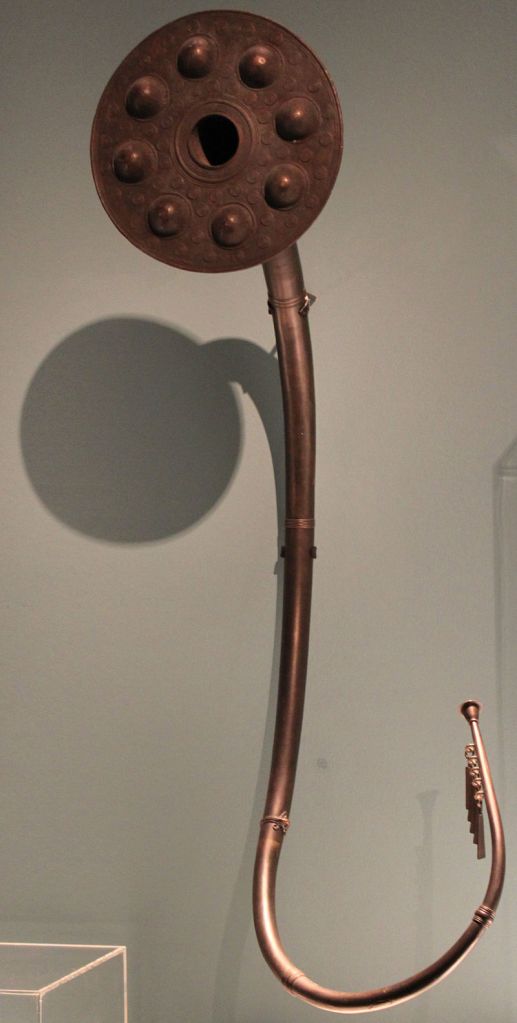As for the Lurs, these bizarre musical instruments were first discovered in 1797 in the Brudevælte Mose bog in northern Zealand. While digging peat, a farmer named Ole Pedersen found six of these large curved brass horns. One end of the tube had a mouthpiece, while the other end, where the blown air exits, had an ornamental plate decorated with six to ten round depressions, with eight being the most common number. Some Lurs that have been found since have small rattling plates at the mouthpiece or the ornamental plate, and some have a carrying chain.