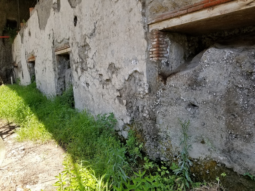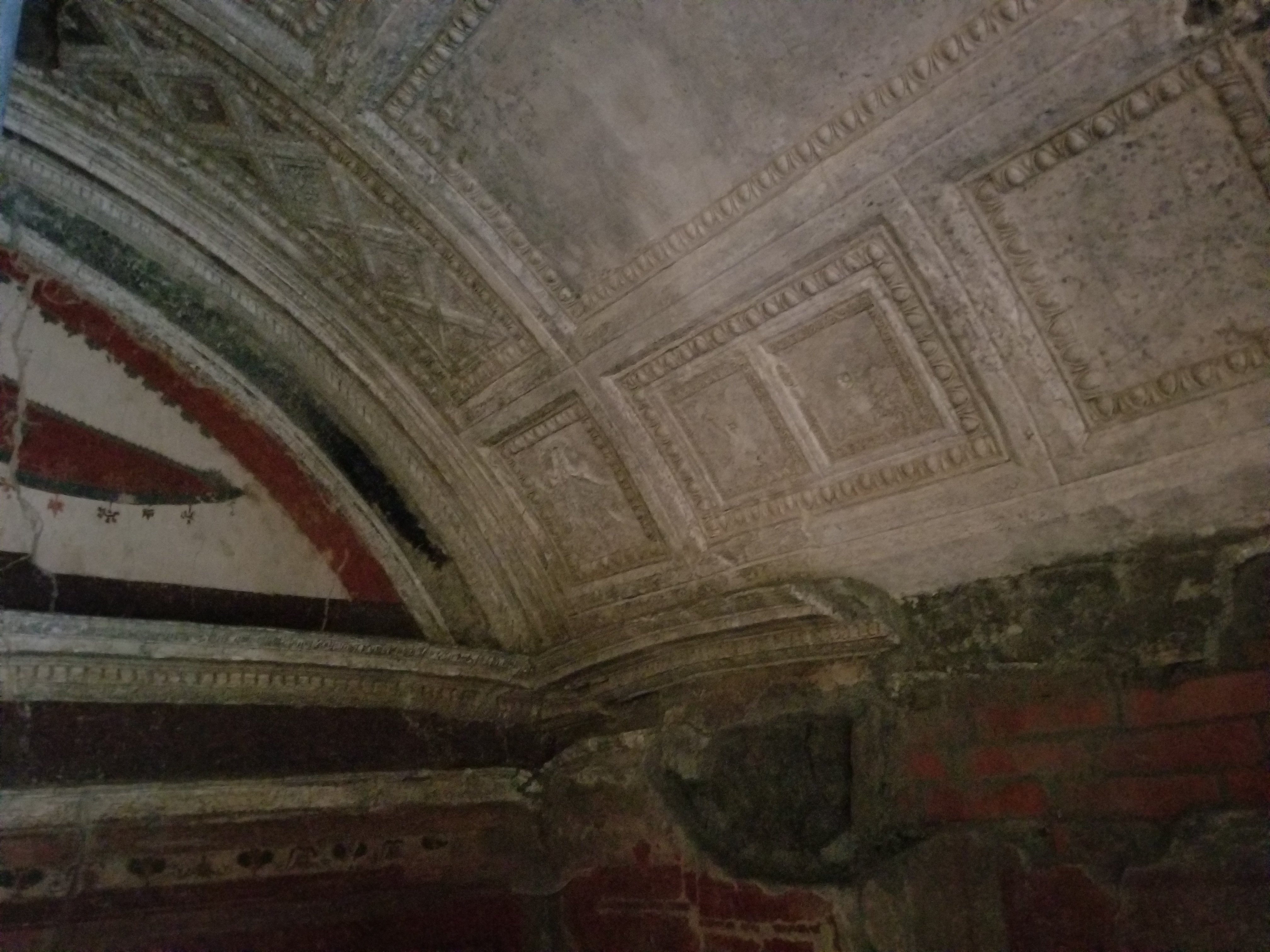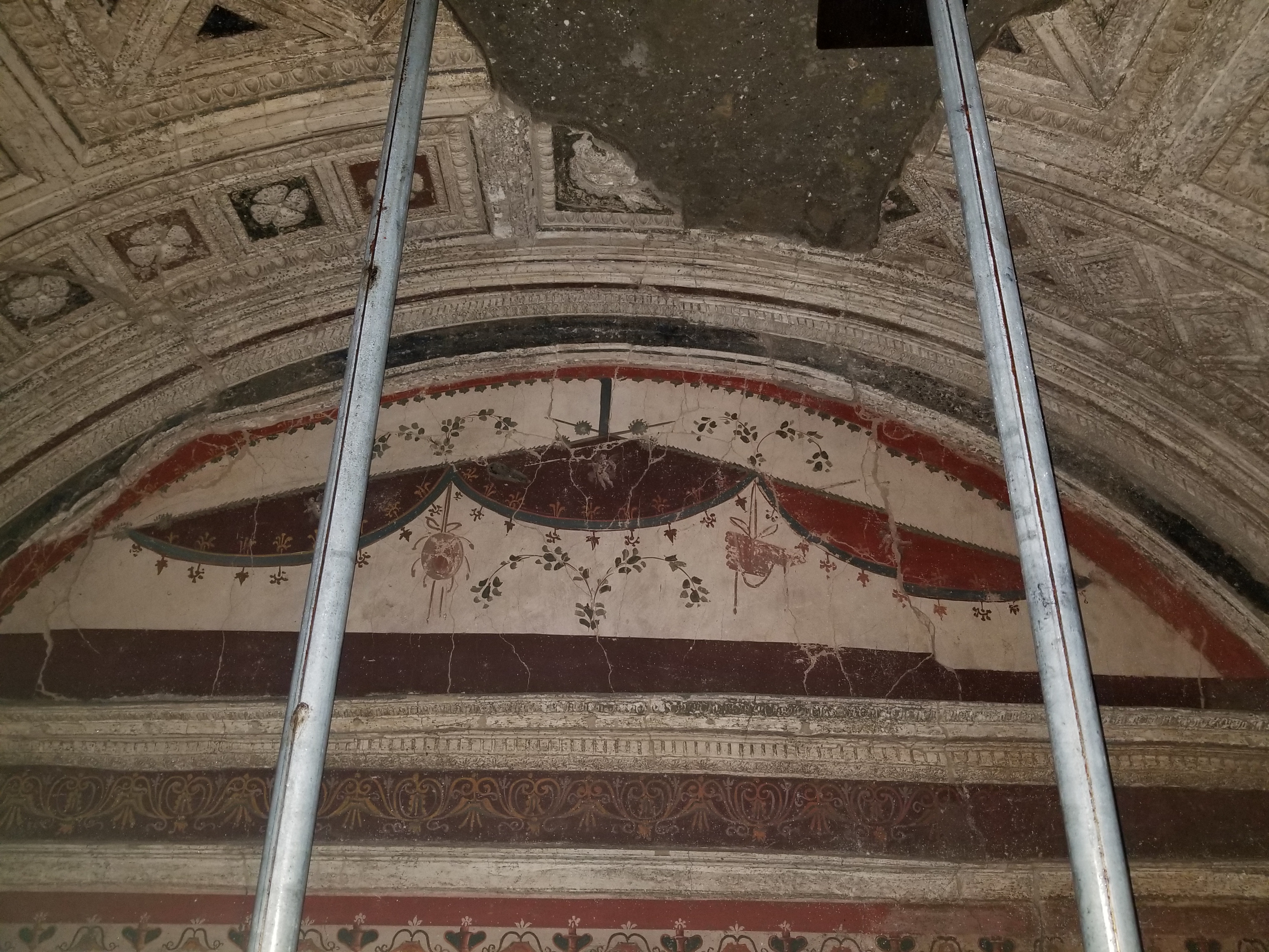 Recently, a trunk with textiles was found, and it is known that the lower floors contain clothing, furniture, and other items. However, the trunk was once again walled up. Further exploration seems too costly, too risky (in terms of conservation and stability), and to make matters worse, there are still inhabited buildings above the villa.