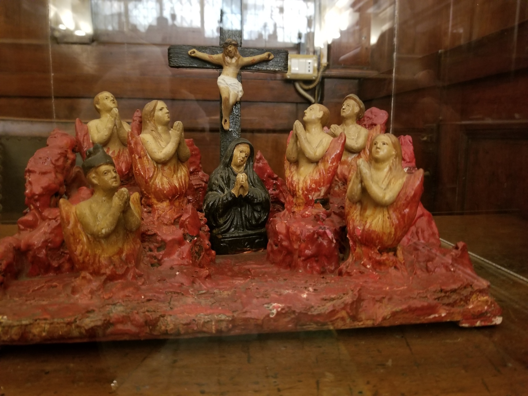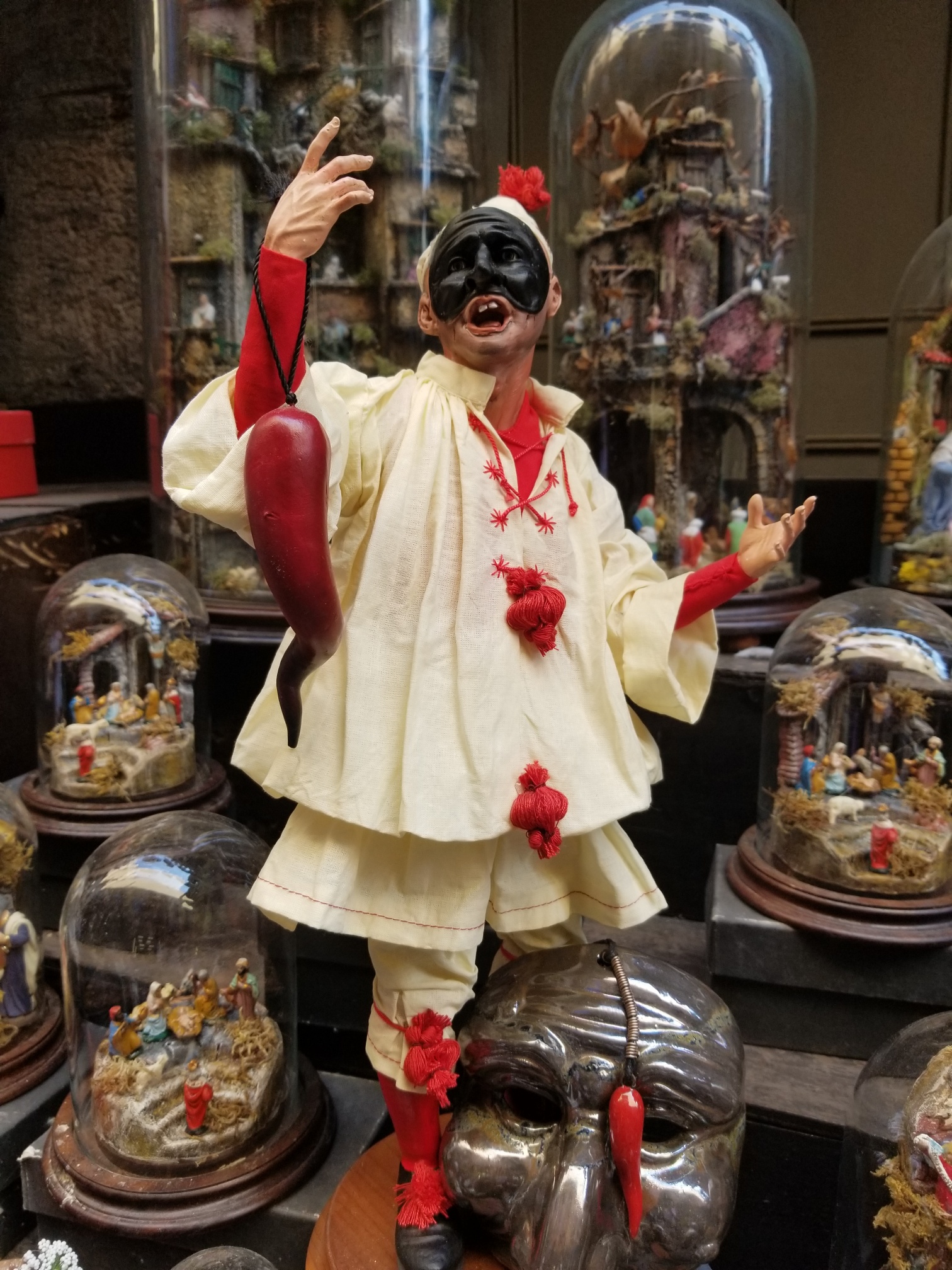To outsiders, these places of veneration for the dead seem strange, but to Neapolitans, they represent tradition. In many street altars of Naples, one can see the souls in purgatory depicted with hands raised in supplication. The famous Pulcinella clown is also a figure that connects the believer with the underworld. Pulciniello, the chick, hatches from the egg of death back to life.