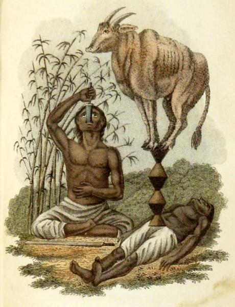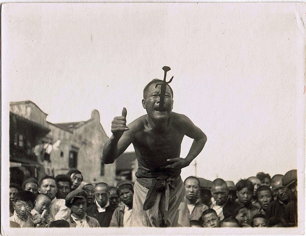 Sword swallowing was performed during the Middle Ages as part of street theatre and was popular at festivals and other large gatherings. According to an early 19th-century English magazine article, the abilities of sword-swallowers in India were considered incredible when first reported in England. In 1813, ‘swallowing the sword’ was advertised as one of the new and astonishing feats performed by the Indian Jugglers then appearing in London. The troupe was led by the famous juggler and sword swallower Ramo Samee, who continued to perform until his death in London in August 1850, having at times also toured Europe and America. The practice is still performed today.