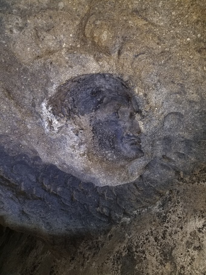 Fig. 9: Impression of the face of the statue of Nunius Balbus, which was recovered from the depths of the Herculaneum theater. The striking impression is located on the ceiling of the excavated part of the theater.