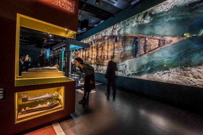 Middle: The archaeological museum of Fuerte El Alto, Campeche, Mexico, a museum recognized by UNESCO as a “Best Practice,” replicates the cave where the displayed artifacts were found. Left & Right: The exhibitions “Egypt’s Sunken Treasures” and “Osiris” by Franck Goddio used light, images, and backgrounds to recreate the excavation context. Neithsabes, CC BY 3.0 via Wikimedia Commons.